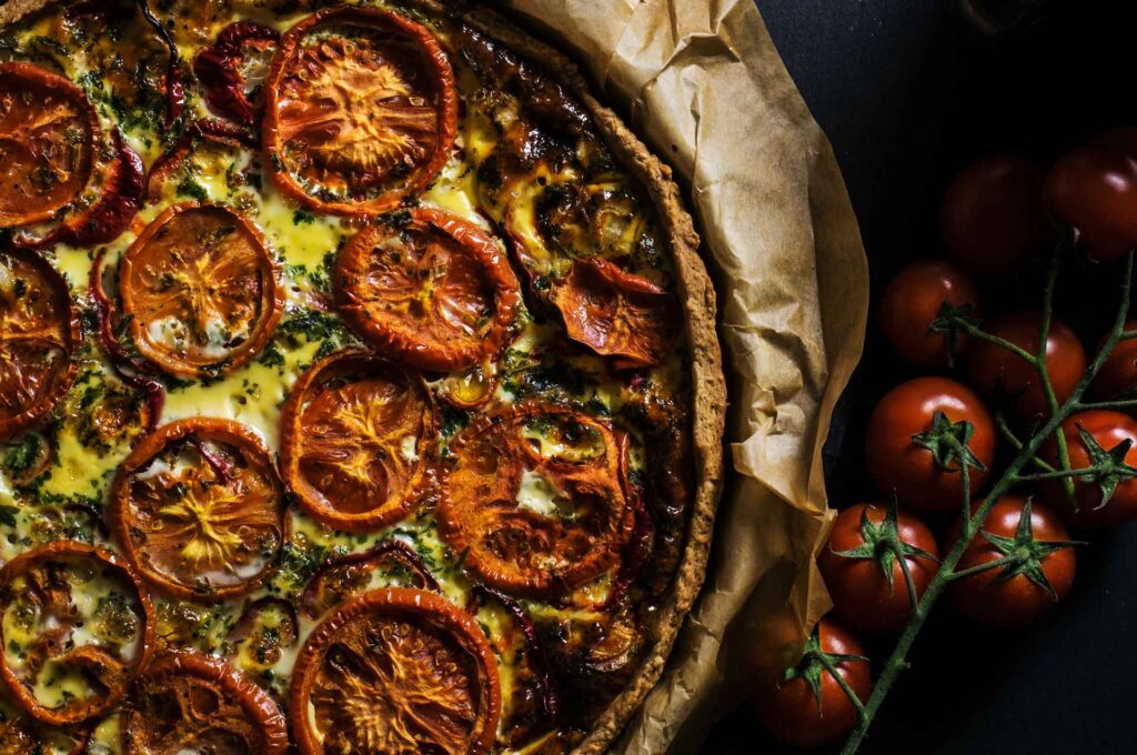 This elegant tart features a savory cream cheese mousse inside a crisp dill-flavored crust, all topped with gleaming slices of smoked salmon.