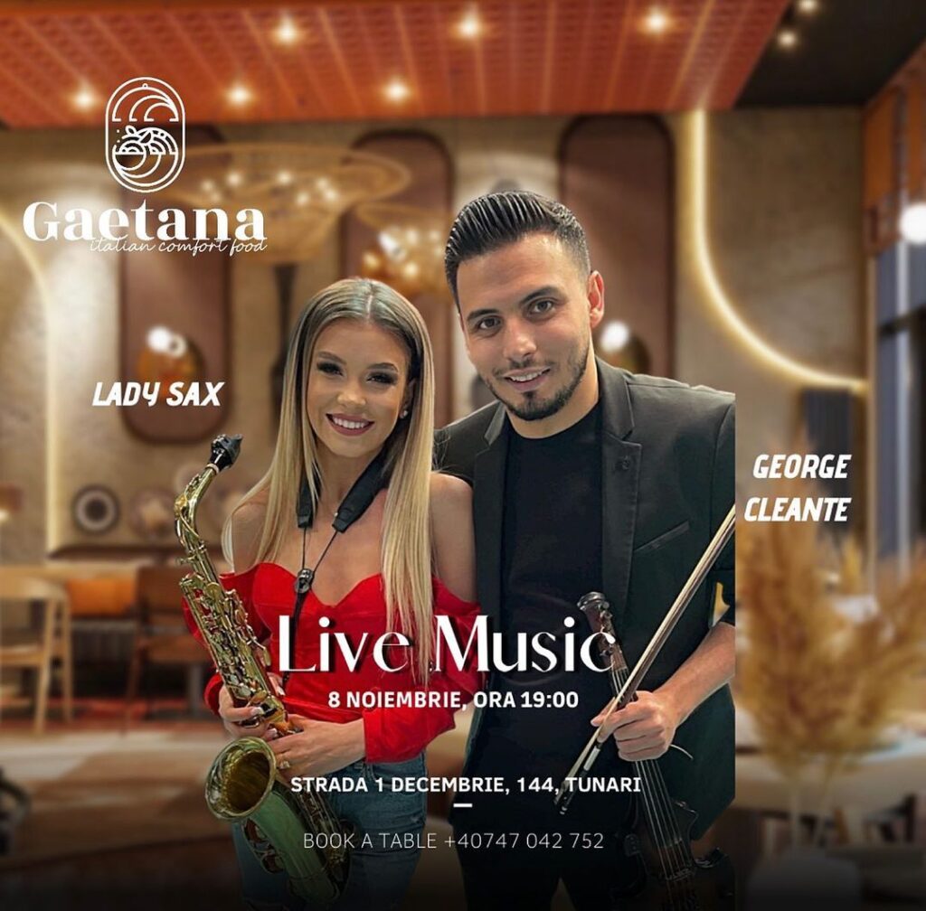 Fie că vrei să iei cina, sau doar să bei un pahar de vin, te așteptăm la Gaetana pe 8 noiembrie pentru a ne bucura împreună de Lady Sax și George Cleante.